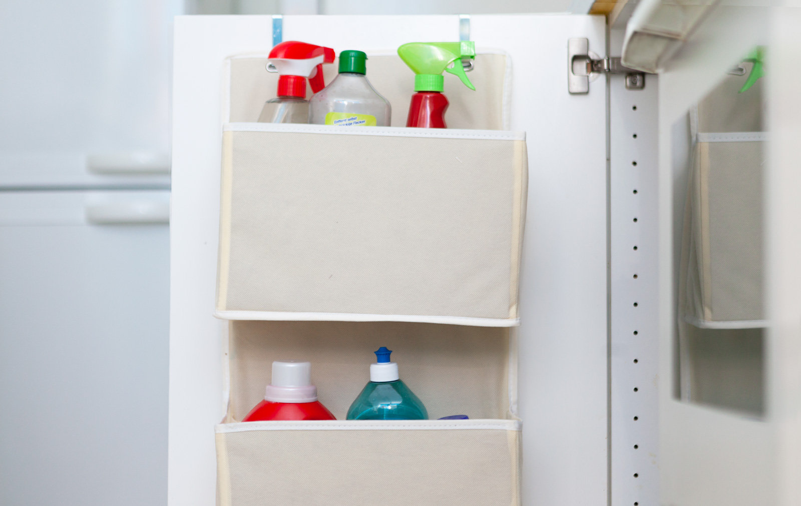 Die Innenseite einer Schranktür lässt sich auch für die Aufbewahrung von Putzmitteln nutzen. Dafür kannst du zum Beispiel einen hängenden Schuhschrank aus Taschen verwenden. Eventuell musst du ihn beschneiden, damit er an eine Küchenschranktür passt. Schon hast du ein praktisches Ordnungssystem für Reinigungsmittel.