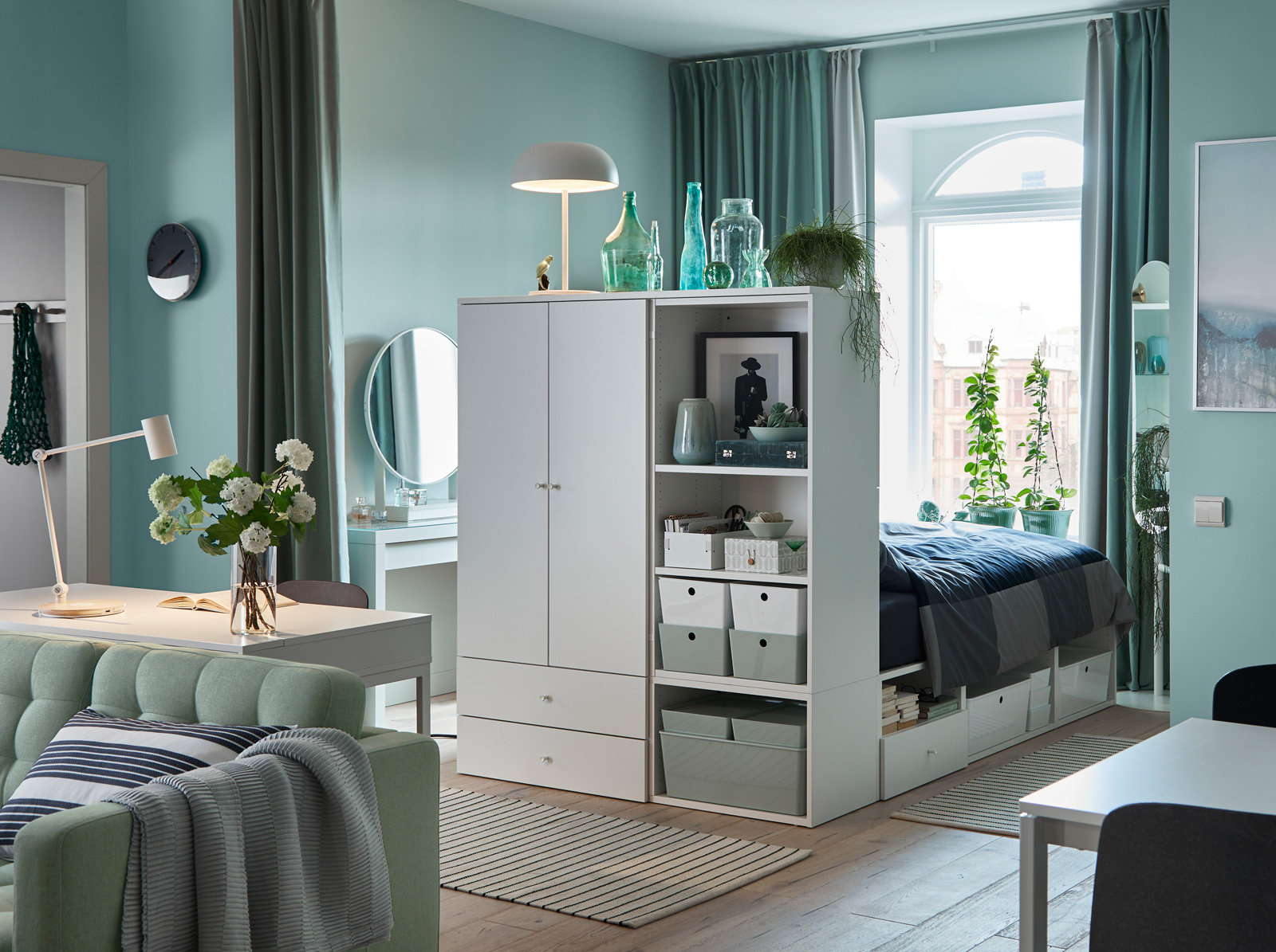 Im Schlafzimmer steckt das größte Potenzial unter dem Bett. Nutze ihn für Kleidung oder Bettwäsche. Betten mit Schubladen oder Klappfunktion sind ideal. Auch Koffer bieten Stauraum. Packe saisonale Kleidung hinein und schiebe sie unter das Bett oder auf den Kleiderschrank.