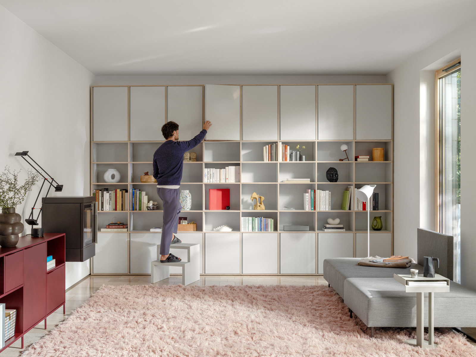 Das Wohnzimmer soll gemütlich sein und gleichzeitig Platz für Bücher, Elektronik, Spiele und Deko bieten. Meterhohe Schrankwände wirken hier jedoch schnell zu wuchtig. Flache Schränke oder Wandregale sind die bessere Lösung.