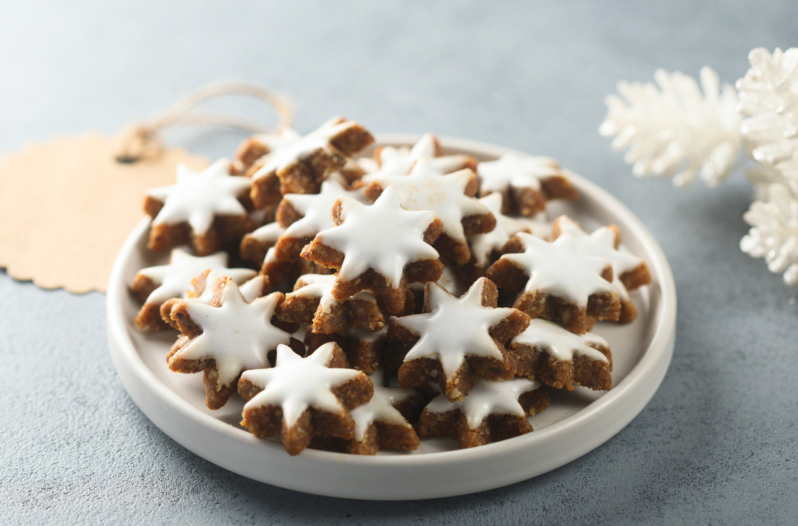 Mische alle Zutaten für den Teig (bis auf das Mehl) sorgfältig miteinander. Der Teig ist sehr klebrig. Bemehle die Arbeitsfläche gut und rolle den Teig etwa ein Zentimeter dick aus. Lässt sich der Teig nur sehr schwer verarbeiten, knete nach und nach etwas Mehl unter. Steche mit einem Sternenausstecher Sterne aus und lege sie auf ein mit Backpapier belegtes Blech. Heize das Backrohr auf 230 Grad vor. Backe die Plätzchen für 5 bis 7 Minuten im Backrohr. Die heißen Sterne sind sie noch recht weich, werden beim Abkühlen aber fest. Misch die Glasur mit Puderzucker und Zimt mit gerade so viel Wasser, bis eine dickflüssige Masse entsteht. Verteile mit einem Teelöffel Glasur auf den Sternen vorsichtig bis zu den Rändern der Spitzen.
