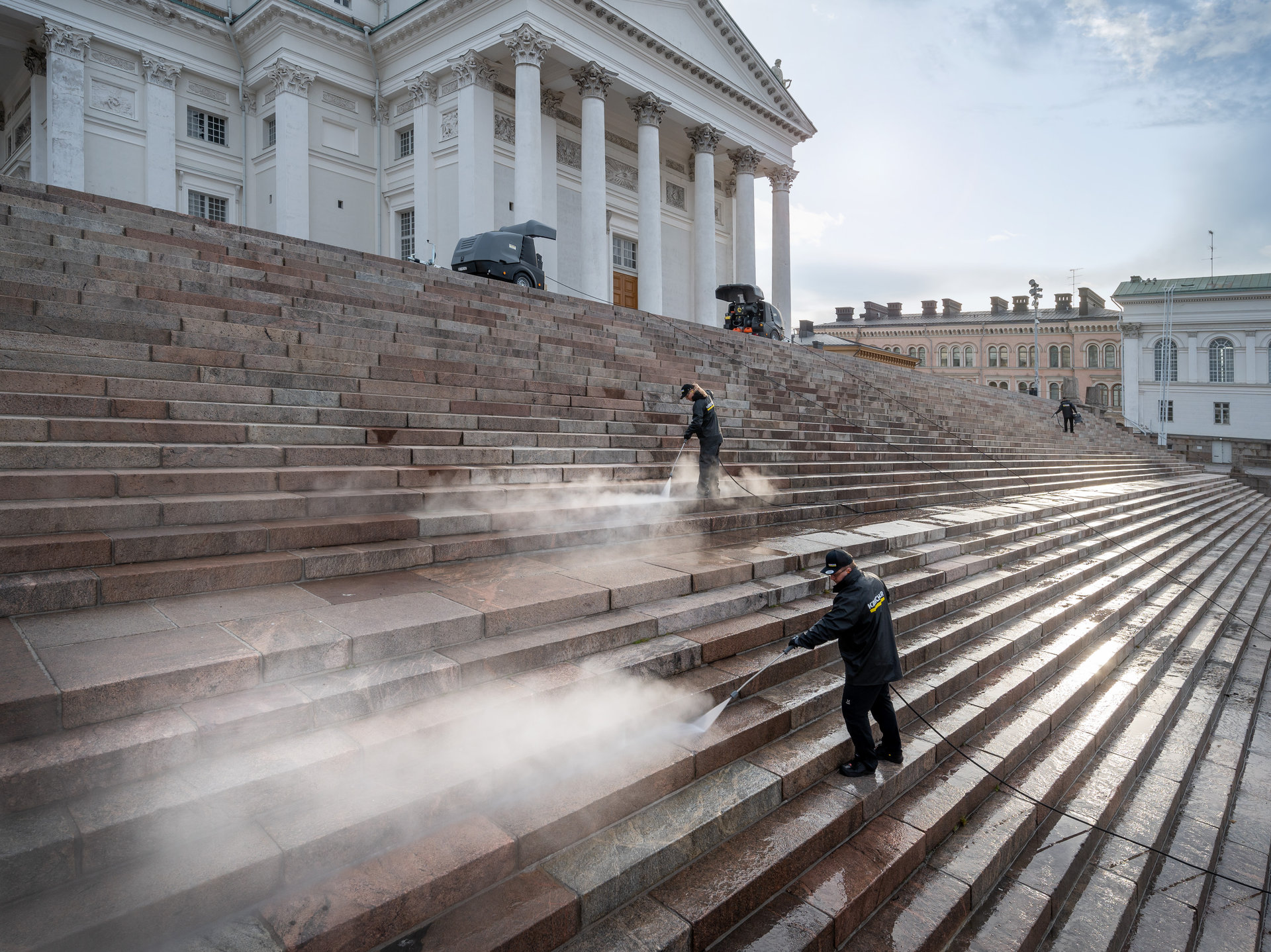 In Österreich haben wir beispielsweise den Vierungsturm der Wiener Votivkirche gereinigt. Unsere hoch qualifizierten Projektteams setzen für sensible Materialien wie Sandstein oder Marmor in Abstimmung mit den zuständigen Denkmalschützern und Restauratoren spezielle Reinigungsmittel und Bürsten ein, die von uns selbst entwickelt werden. Und auch der Wasserdruck der Hochdruckreiniger wird so angepasst, dass die Bausubstanz geschützt wird.