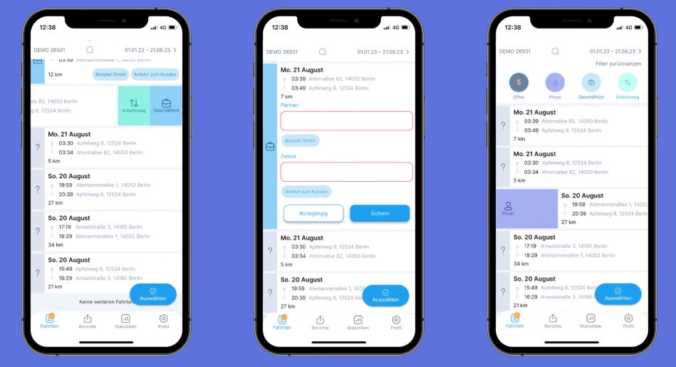 Die Daten wie Abfahrts- und Ankunftsort, die gefahrenen Kilometer und die gefahrene Strecke werden automatisch erfasst. Die meisten Apps erinnern dich daran, fehlende Angaben wie den Zweck der Fahrt zu vervollständigen. Das spart Zeit und garantiert, dass du keine wichtigen Eintragungen vergisst. Die Nutzung ist denkbar einfach.