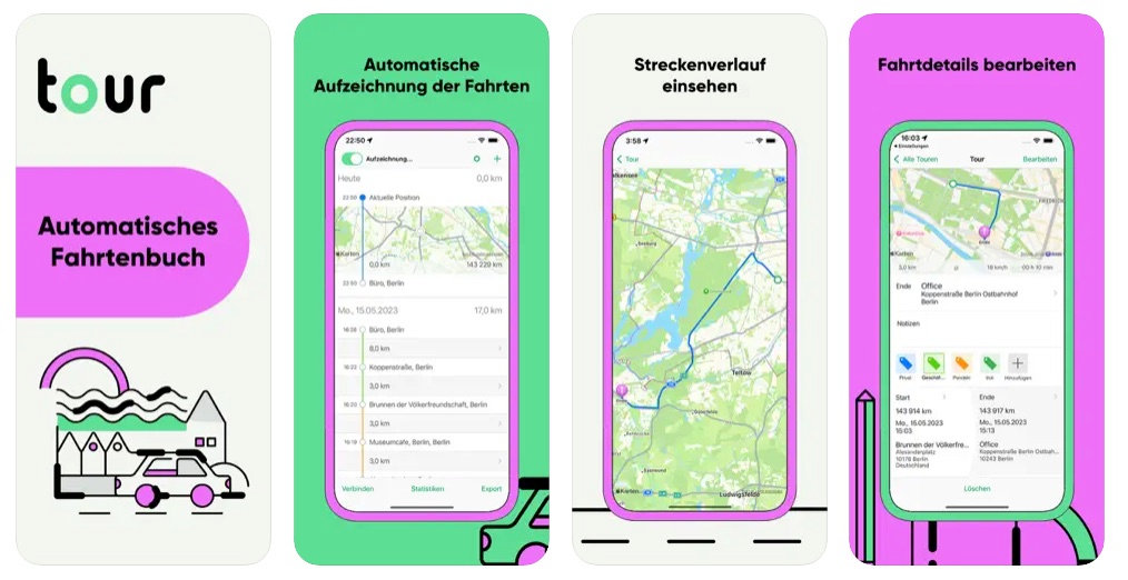 Tour richtet sich an Einzelpersonen und macht dank automatischer GPS-Erfassung das Führen des Fahrtenbuchs so einfach wie möglich. Die App läuft im Hintergrund und erkennt automatisch, wenn eine Fahrt beginnt und endet. Nach der Abfahrt musst du nur per Klick oder Wisch die Art der Fahrt festlegen.