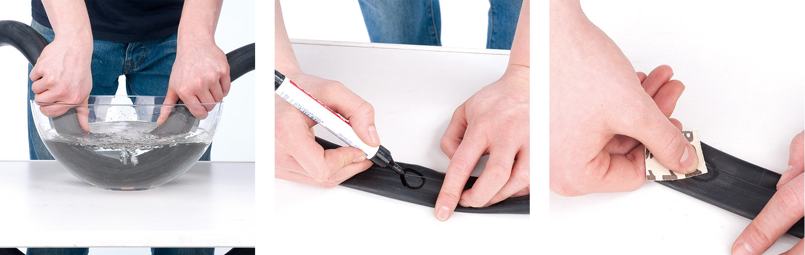 Hast du das Loch gefunden, säubere, trockne und markiere die Stelle um das Loch und raue die Oberfläche mit Schmirgelpapier auf. Es gibt selbstklebende Flicken oder solche, die mit einer Vulkanisierungslösung verwendet werden. Bei Letzteren bestreichst du die angeraute Stelle dünn mit der Lösung und lässt sie fünf Minuten antrocknen. Danach setzt du den Flicken auf und drückst ihn fest.