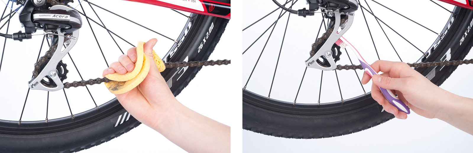 Werkzeug: Kübel Wasser, Schwamm, Spülmittel, Lappen, Kettenreiniger, Zahnbürste, speziell vorgesehene Bürste, Zahnstocher und Fahrradketten-Öl