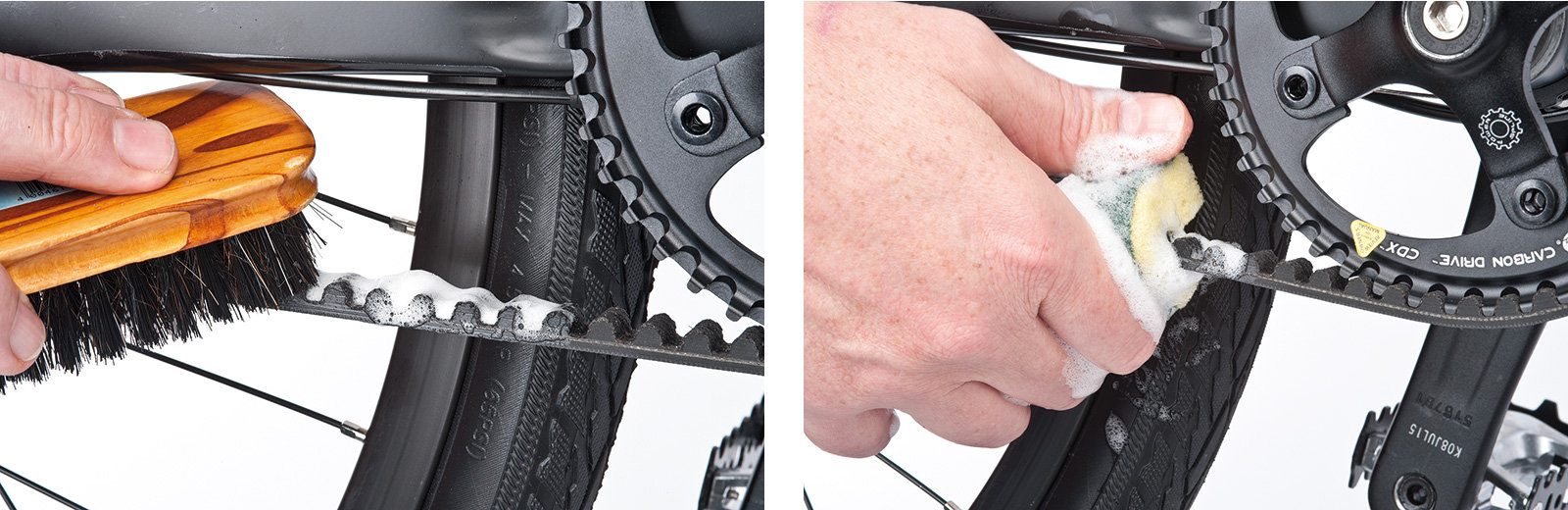 Wenn du einen Zahnteilungs-Carbonfaser-Riemen anstelle einer herkömmlichen Fahrradkette hast, reinigst du den sogenannten Gates-Riemen zunächst mit einer weichen Bürste. Für die Feinwäsche trägst du Fahrradreiniger mit derselben Bürste auf und lässt ihn ein paar Minuten einwirken. Danach reibst du mit einem nassen Schwamm mit Spülmittel die Ober- und Unterseite ein. Zum Schluss spülst du mit klarem Wasser nach. Ein Gates-Riemen wird nicht geölt.