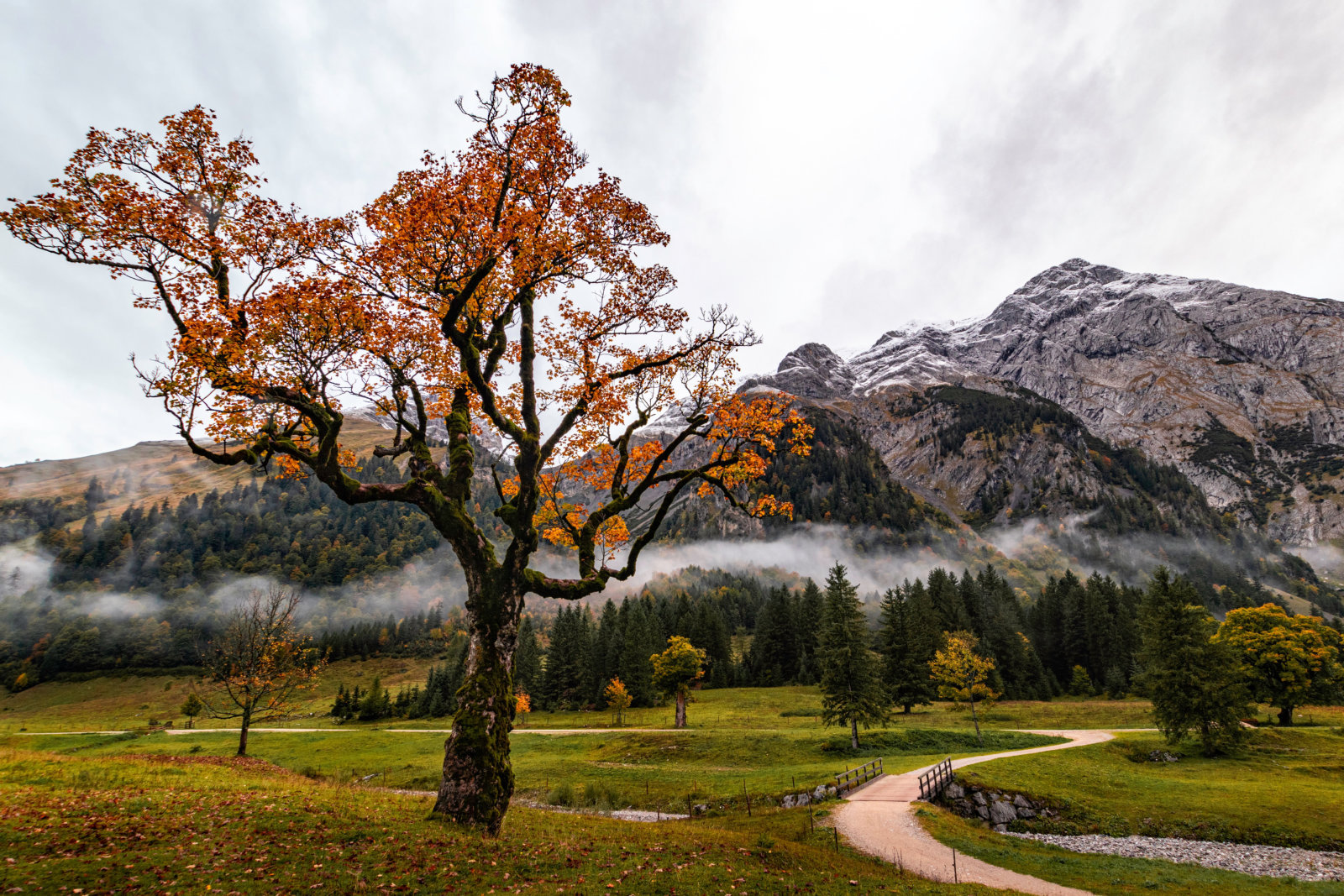 Der Naturpark Karwendel steht seit 1928 unter Naturschutz und zählt zu den ältesten Schutzgebieten Europas. Der Herbst mit seinen bunten Farben ist ideal für Wanderungen. Österreichs größter Naturpark besticht zu jeder Jahreszeit mit felsigen Bergflanken, weiten Wäldern und sanften Almwiesen. Die rot, gelb, goldenen Wälder im Herbst sind aber besonders beeindruckend: Eine Wanderung bergauf aus dem nebelverhangenen Tal wird mit einer atemberaubenden Aussicht über das Nebelmeer belohnt. Wer etwas höher mit der Erkundung der Region beginnen möchte, dem bietet das Almdorf Eng auf 1250 Metern am Fuße des Großen Ahornbodens einen guten Ausgangspunkt für Wanderungen durch den Naturpark.